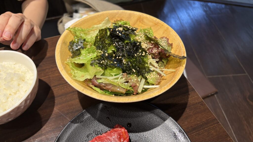 サラダは韓国海苔をまぶしてごま風味。
