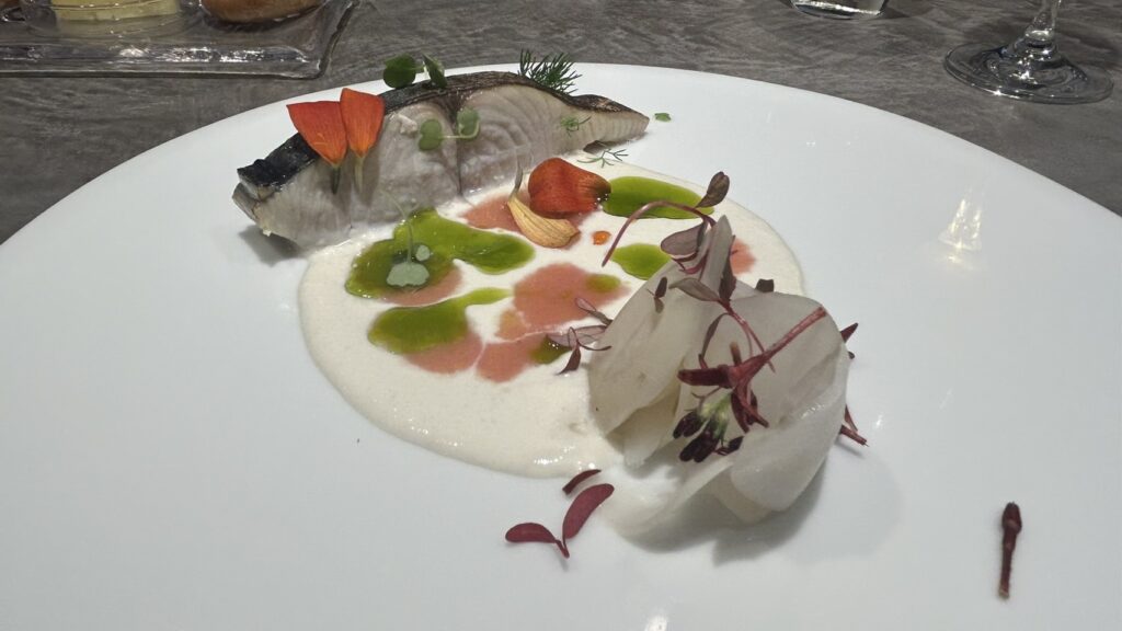 さわらのコンフィはカブや赤しそでさっぱりと。