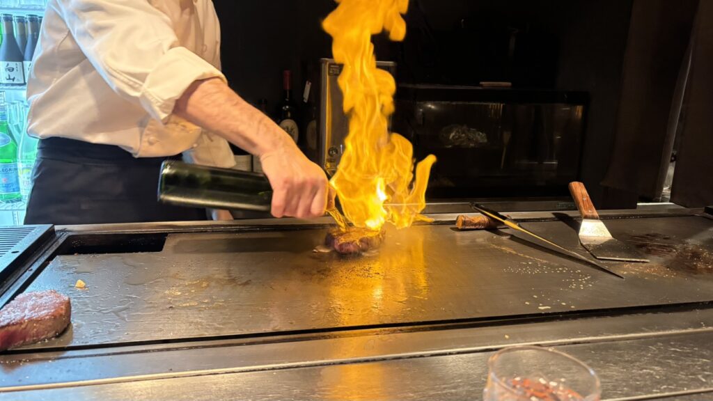 お肉をフランベしているところ。