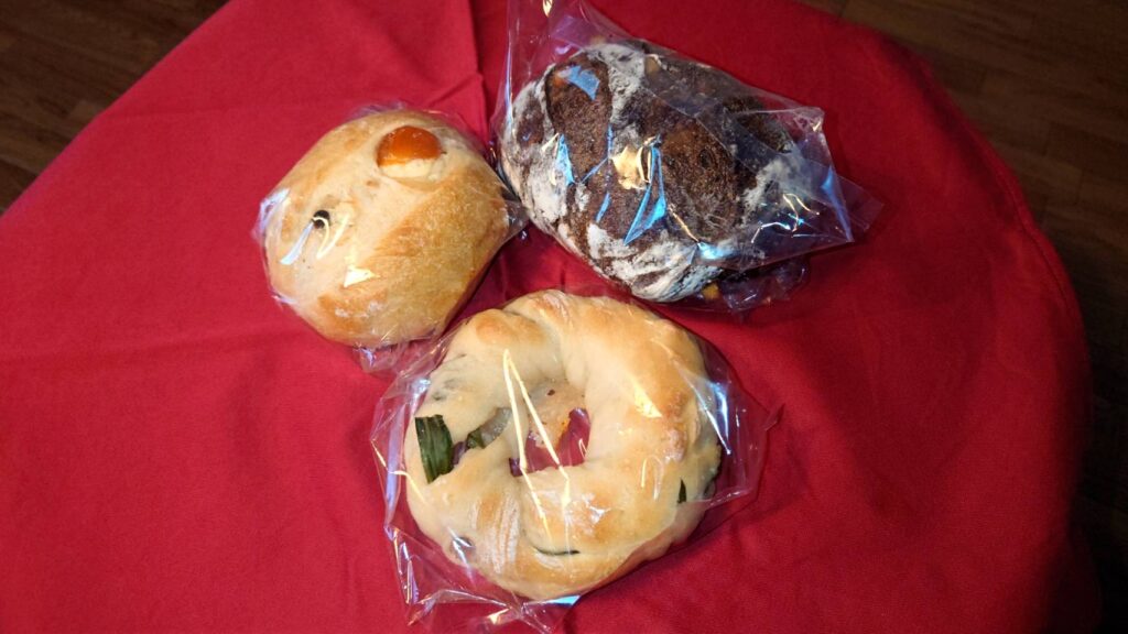 購入したのはオレンジショコラ、きんかんとクリームチーズ、行者にんにくとベーコンのパン。