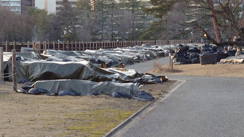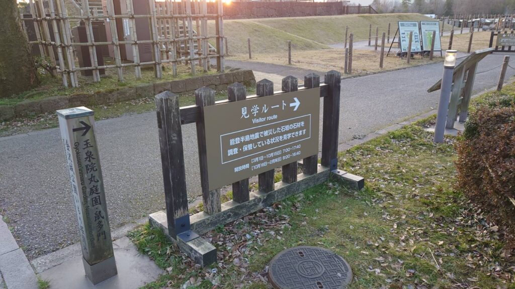 ふと通りかかると、能登半島地震で崩落した金沢城の石垣の見学ルートが出来ていました。
