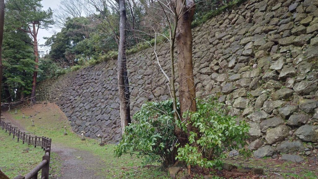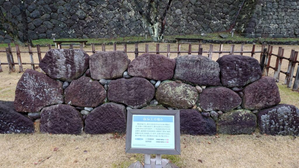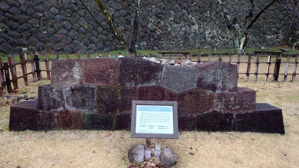 後日反対側から歩いてみると、石垣のレプリカがおいてあるんですね。